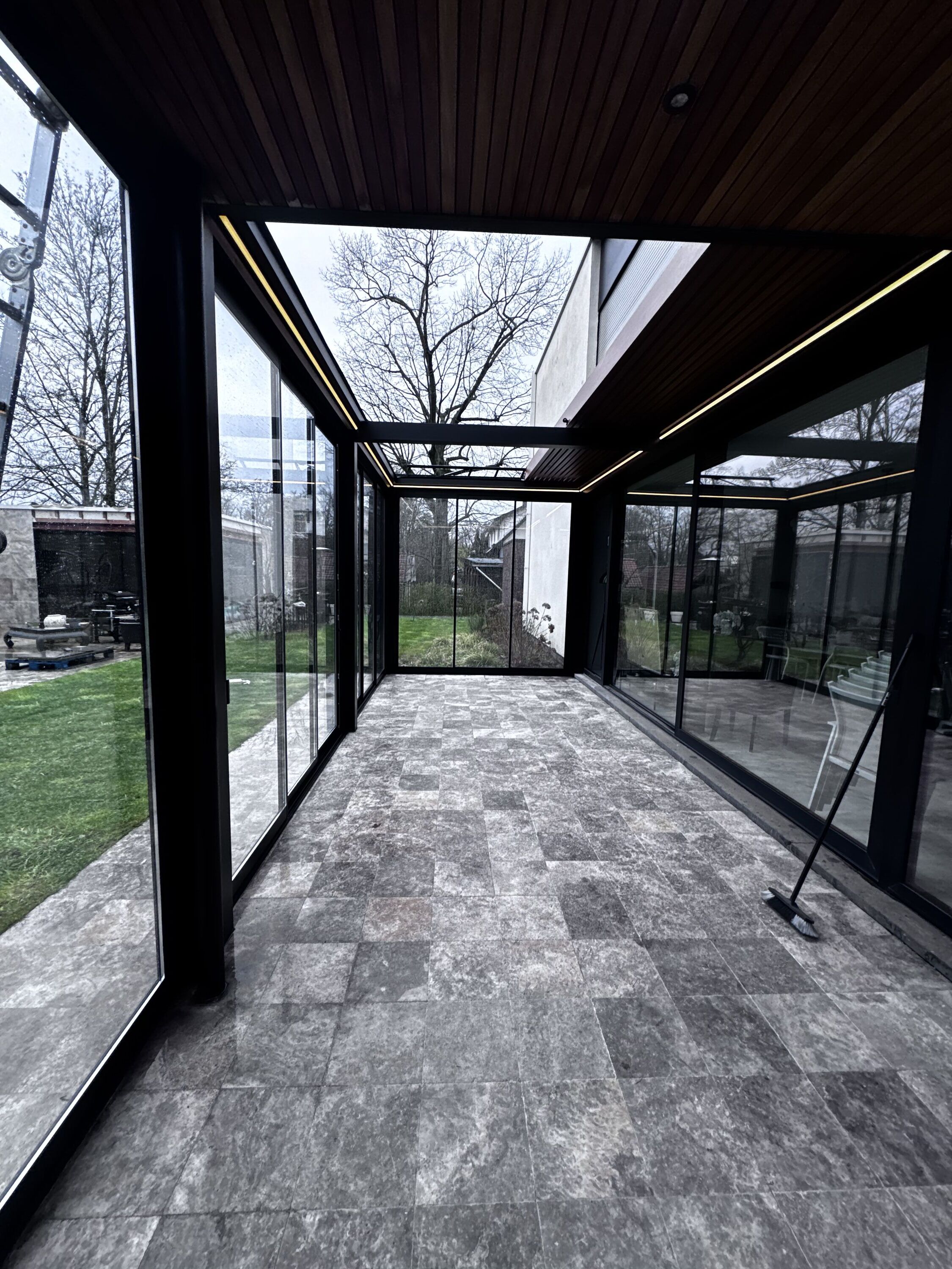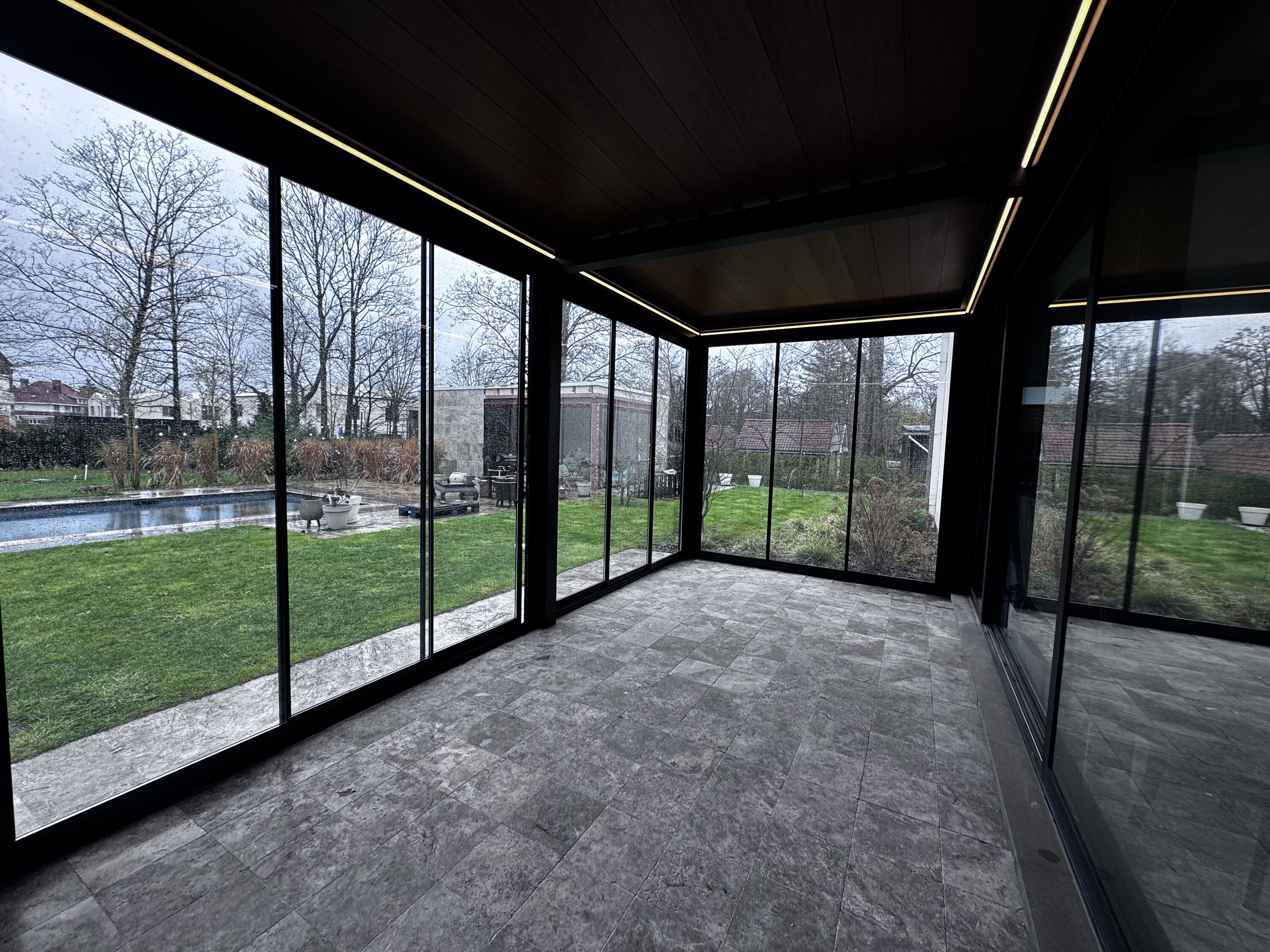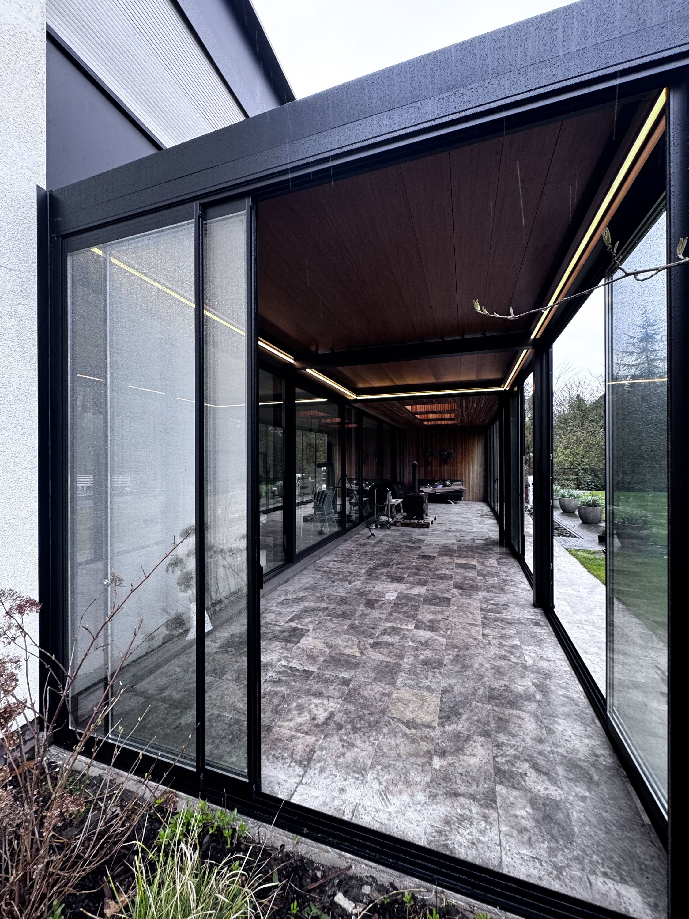 De combinatie met dubbele beglazing en stijlvolle schuiframen zorgt voor een optimaal binnen-buitengevoel, waarbij comfort en energie-efficiëntie centraal staan. Dankzij deze oplossing geniet de klant van een lichtrijke, beschutte ruimte die het hele jaar door bruikbaar is, ongeacht de weersomstandigheden.