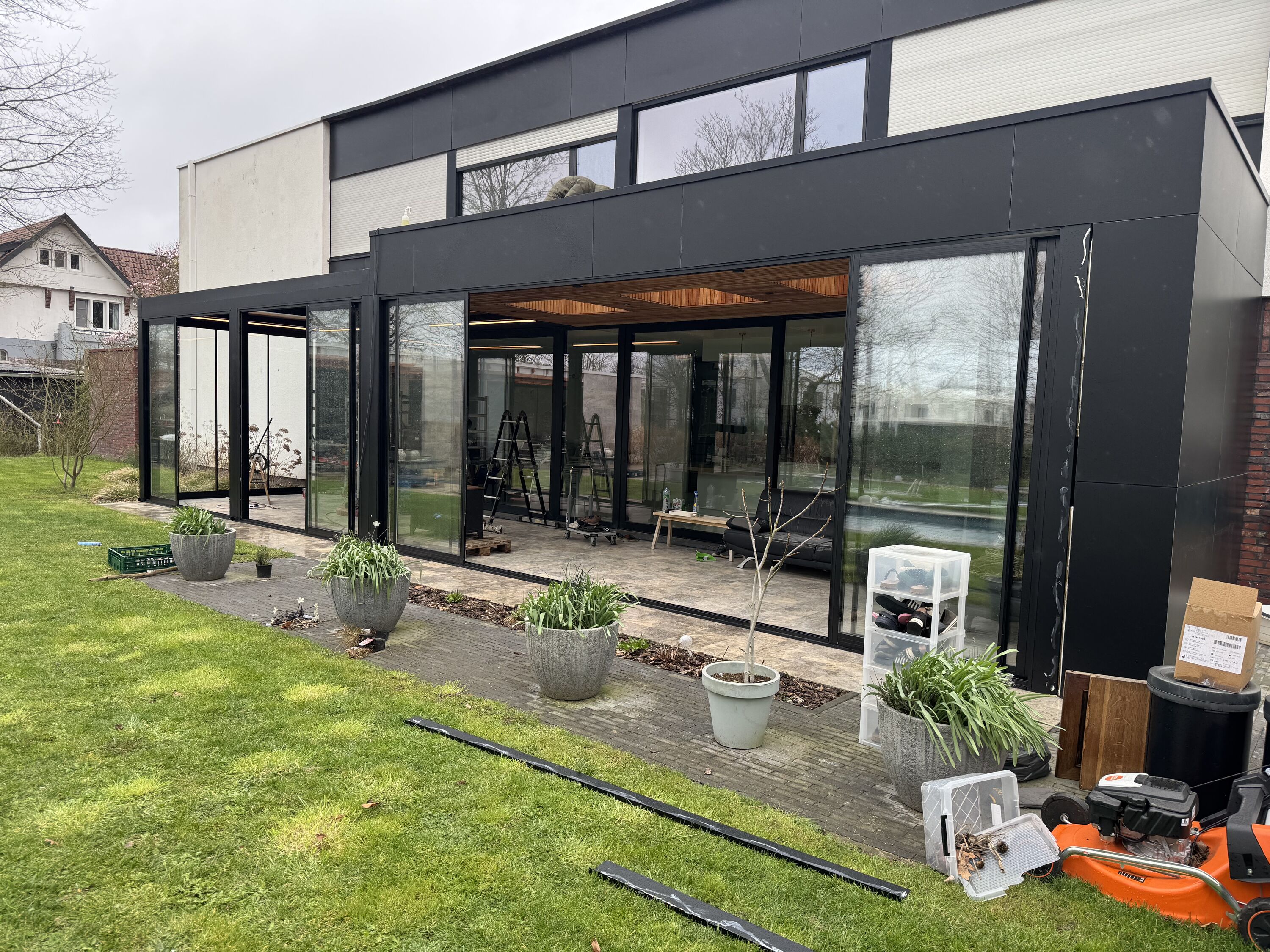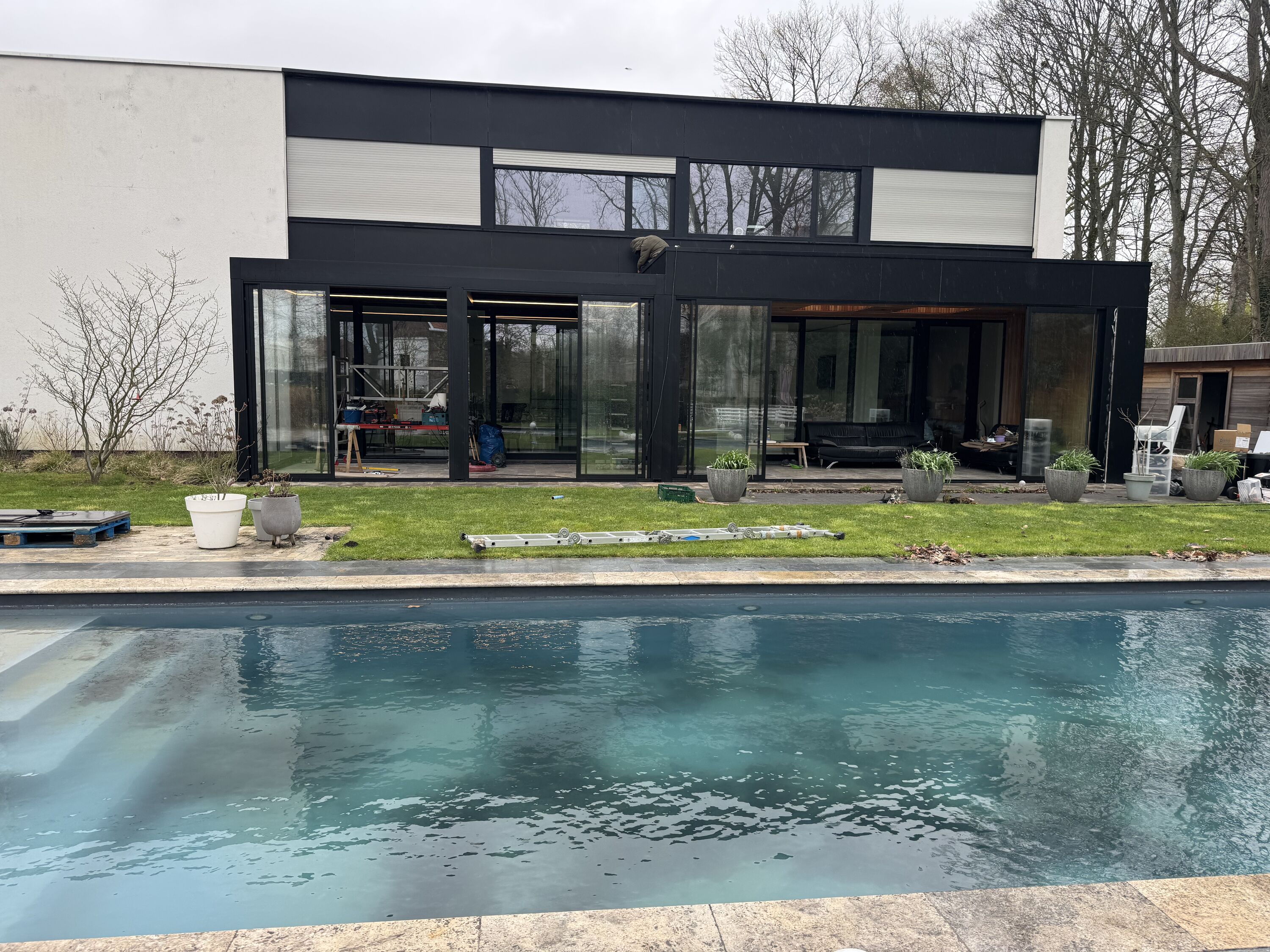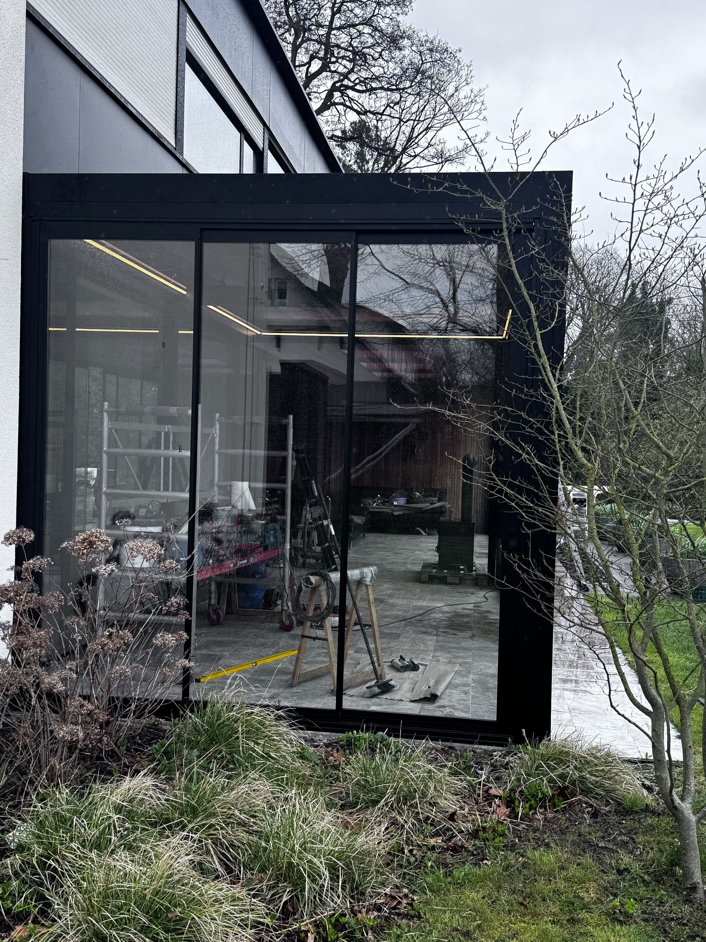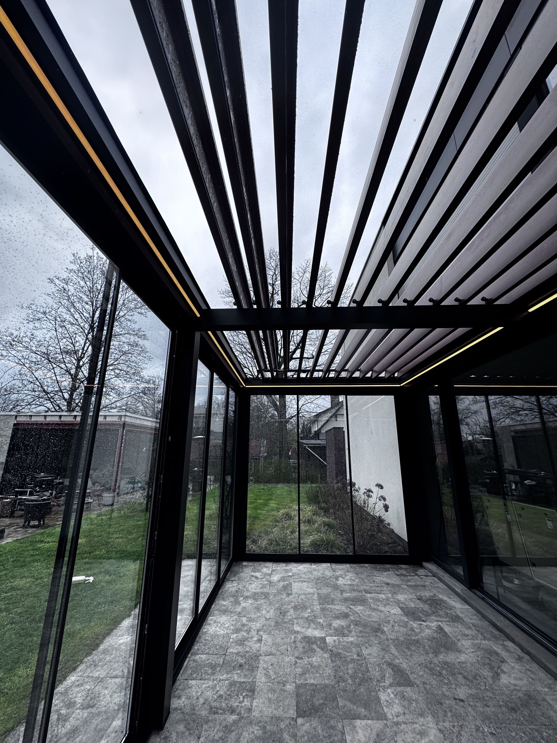 De combinatie met dubbele beglazing en stijlvolle schuiframen zorgt voor een optimaal binnen-buitengevoel, waarbij comfort en energie-efficiëntie centraal staan. Dankzij deze oplossing geniet de klant van een lichtrijke, beschutte ruimte die het hele jaar door bruikbaar is, ongeacht de weersomstandigheden.