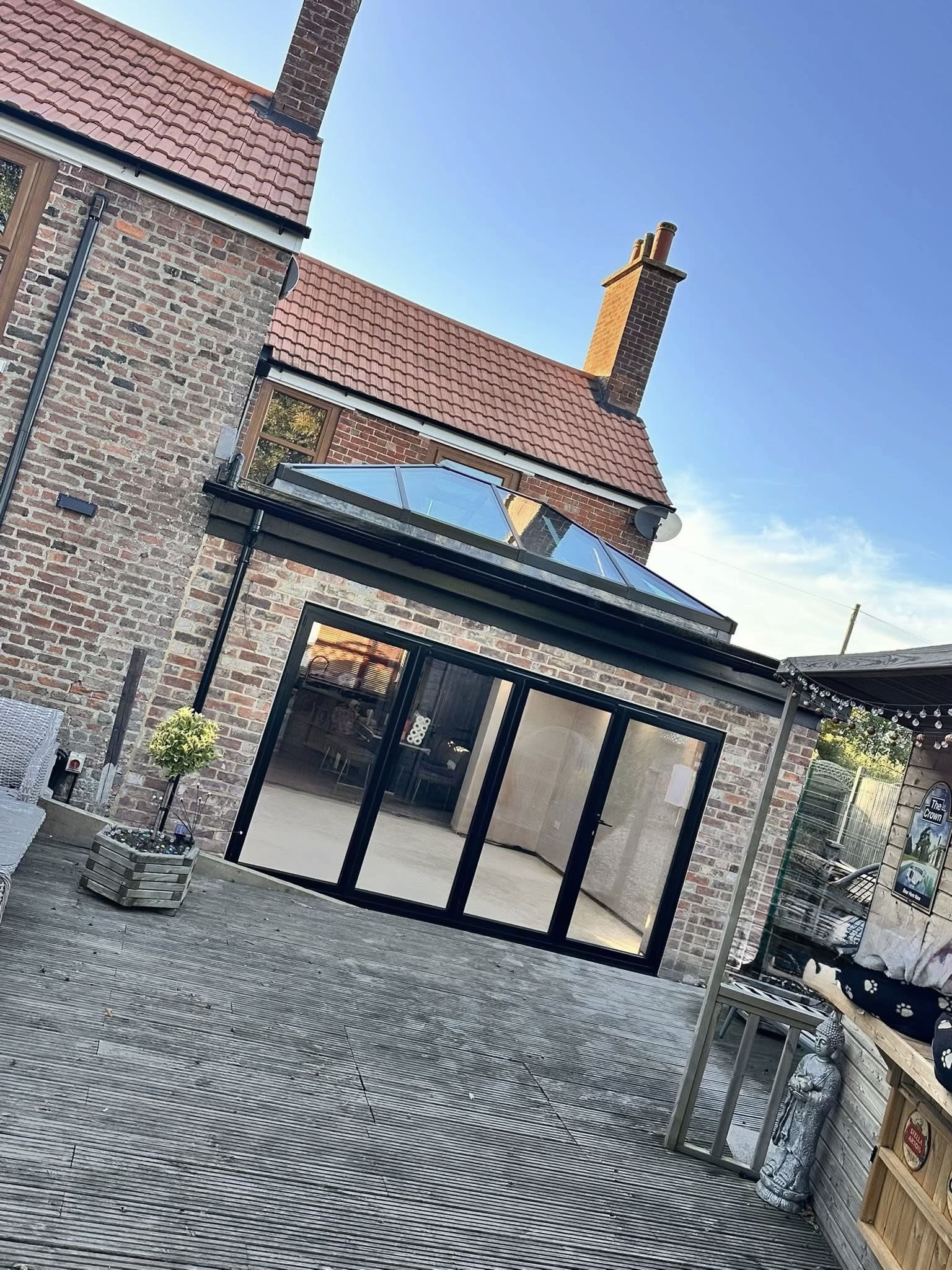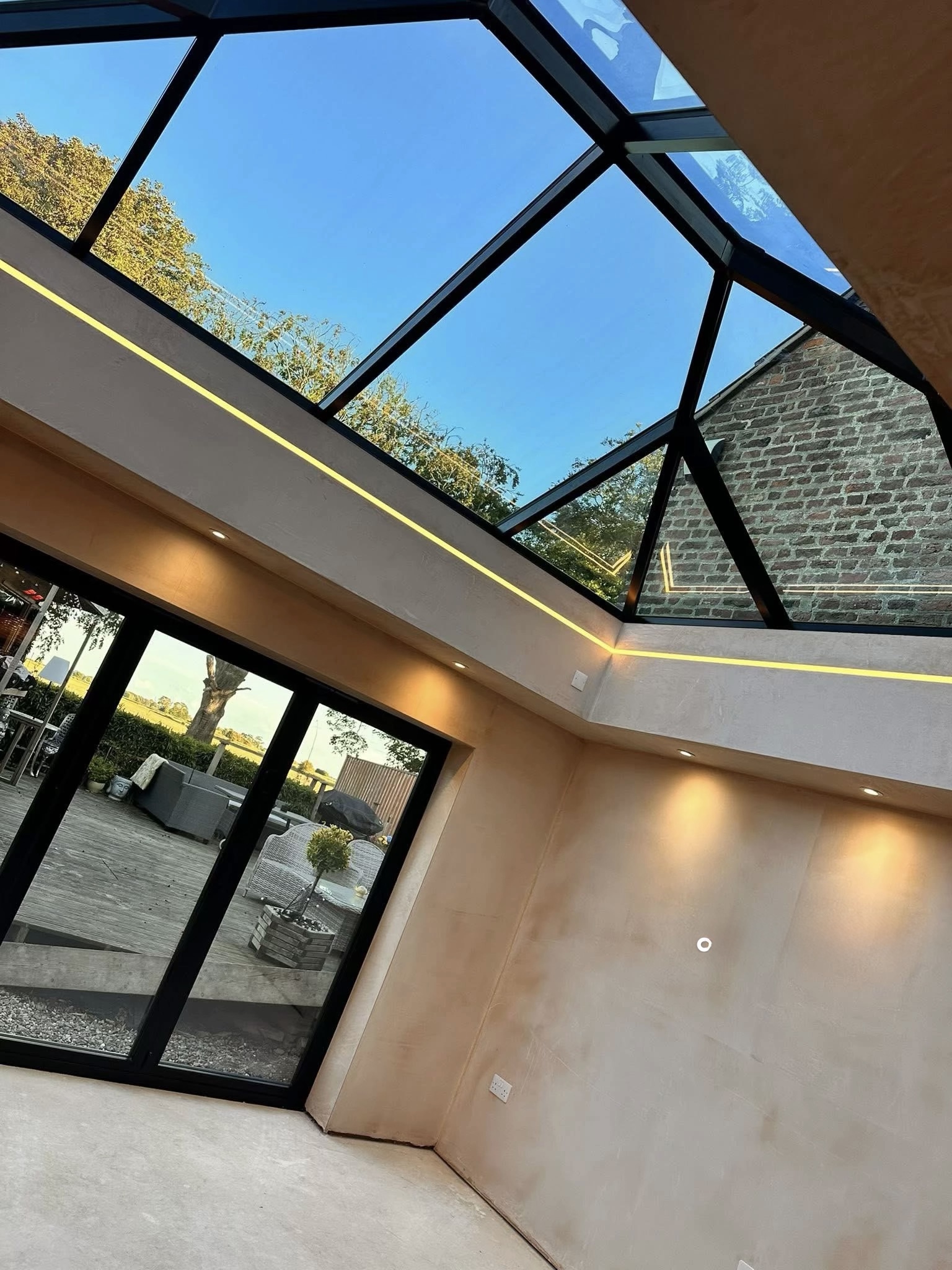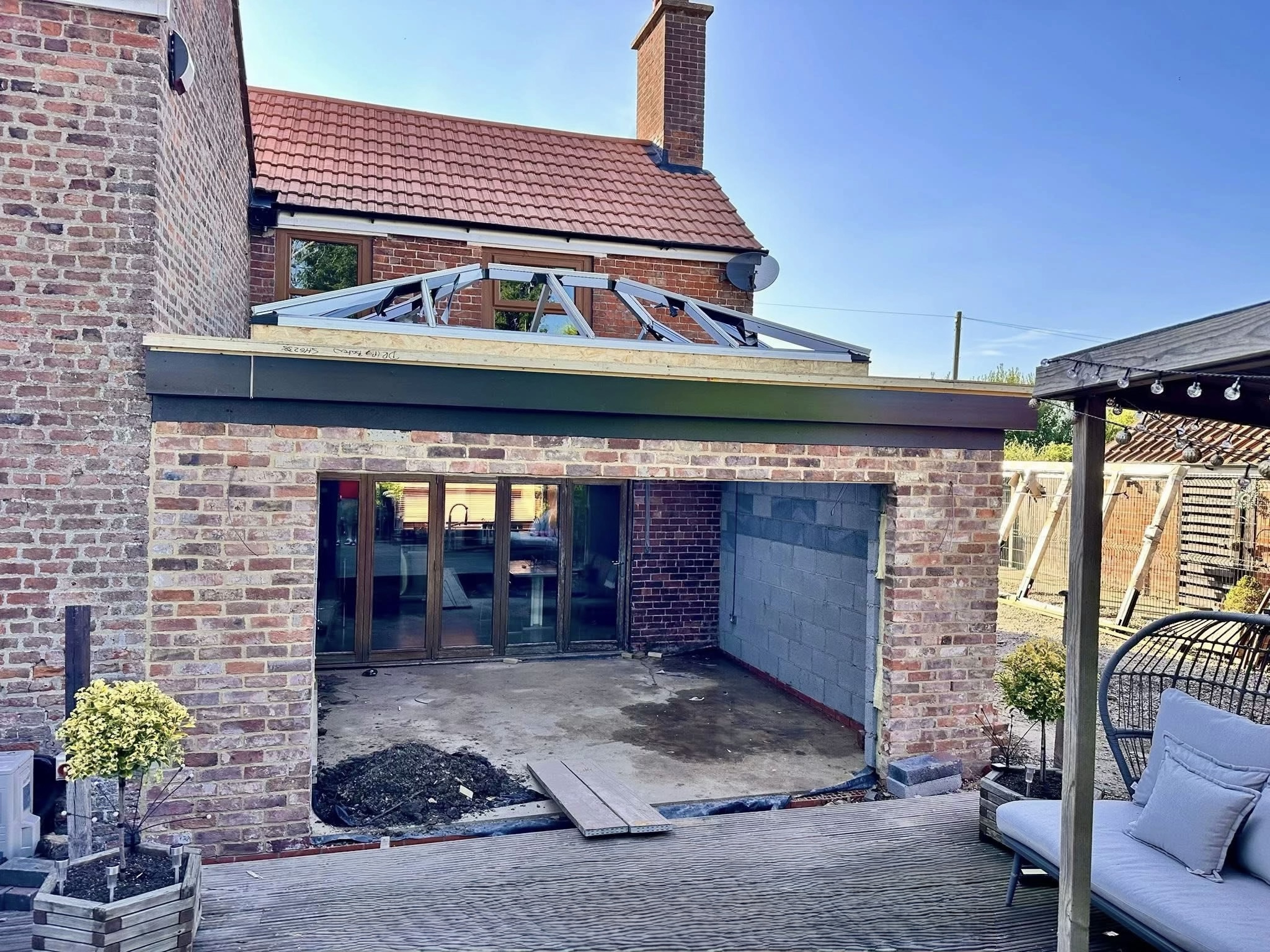 Op het terras installeerden we een hoogwaardig, inklapbaar lamellendaksysteem dat zorgt voor maximale flexibiliteit en comfort. Zo kan er in elk seizoen optimaal genoten worden van de buitenruimte, met controle over zonlicht en beschutting tegen weer en wind.