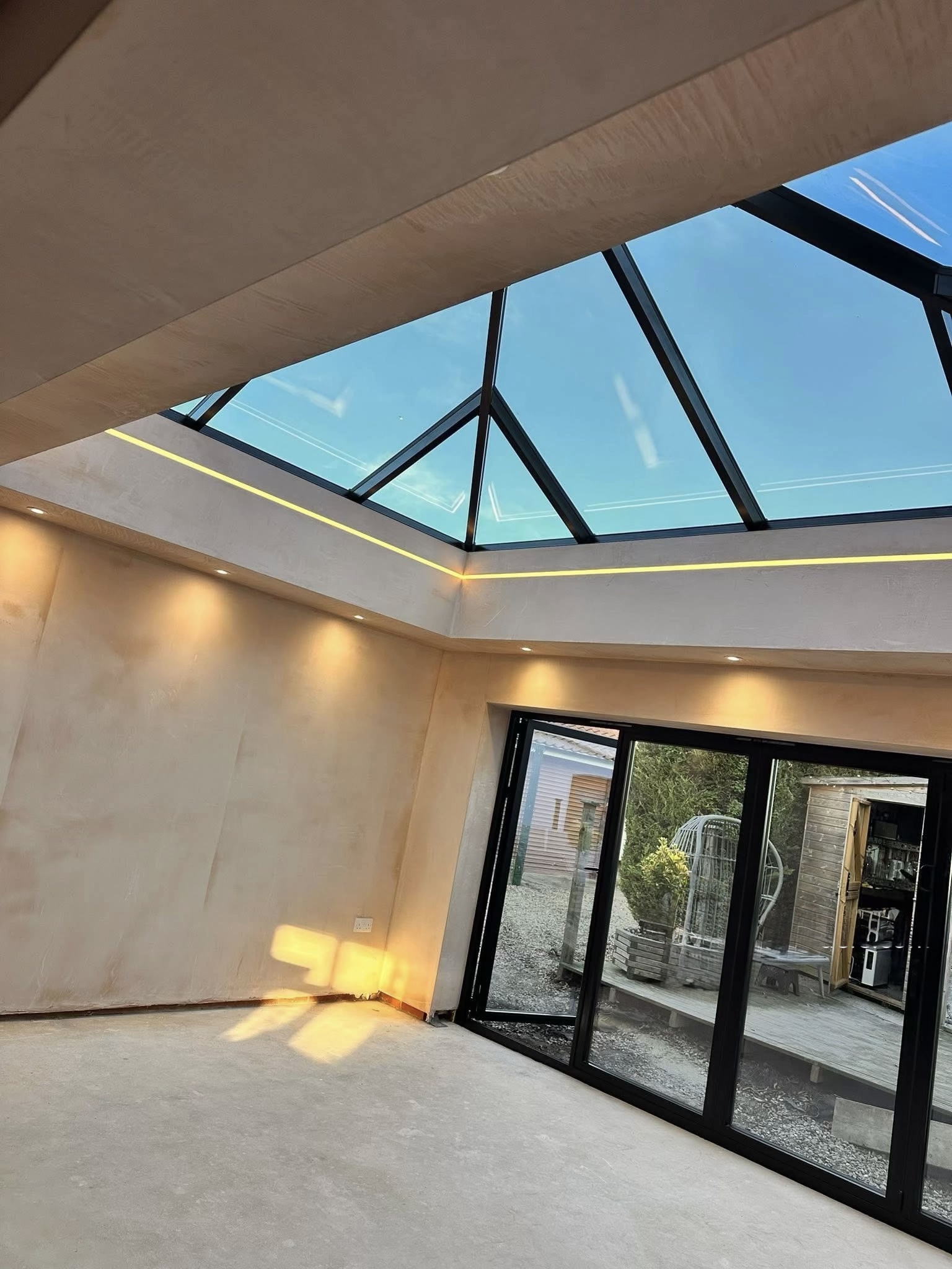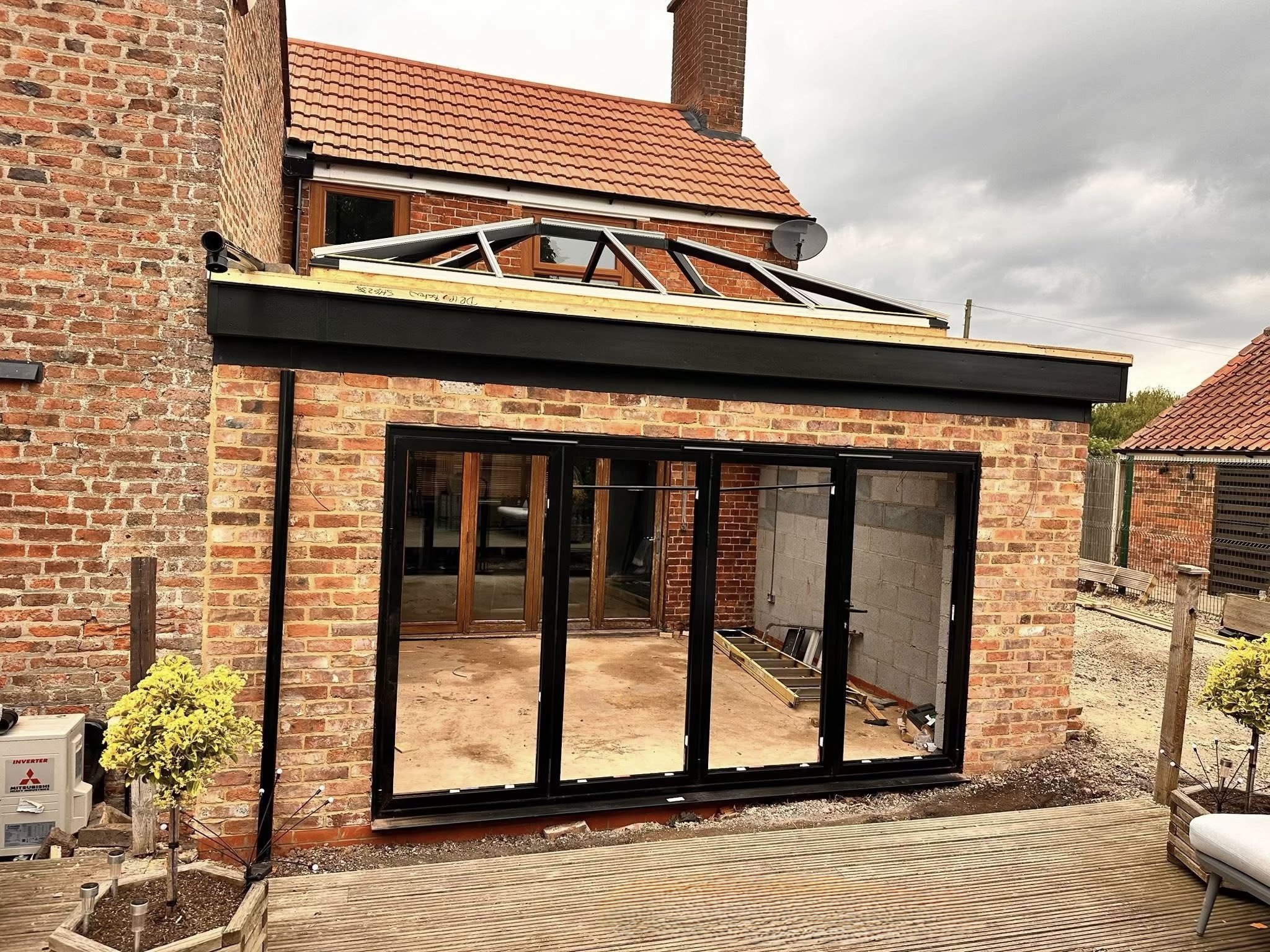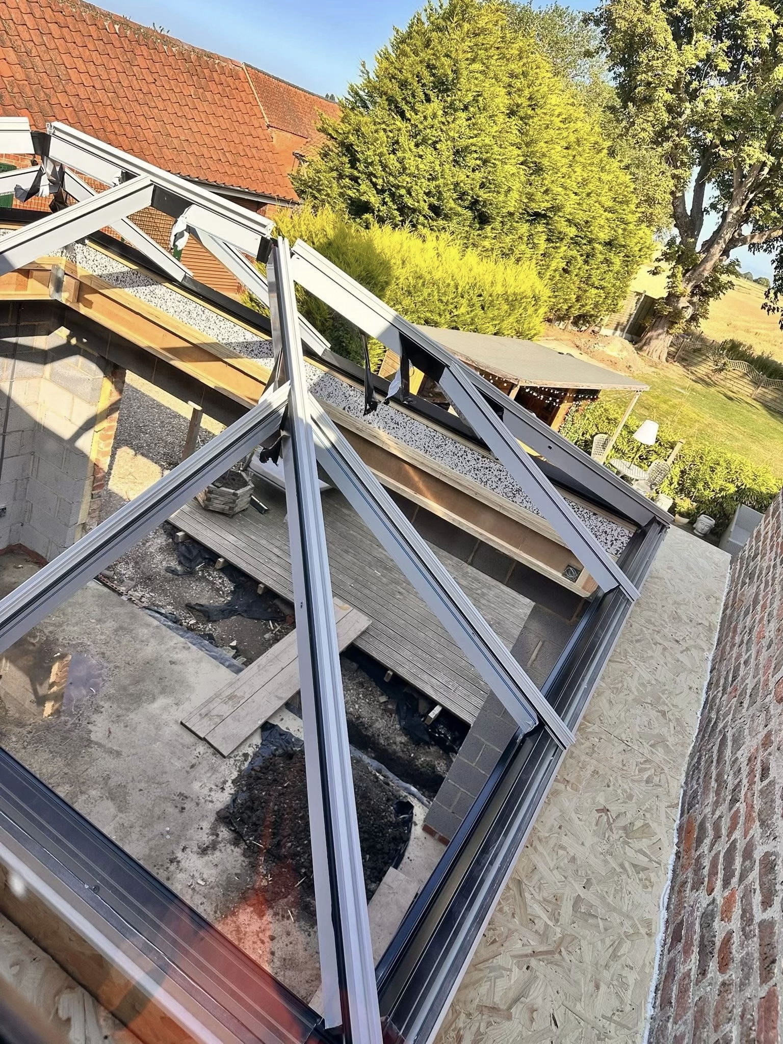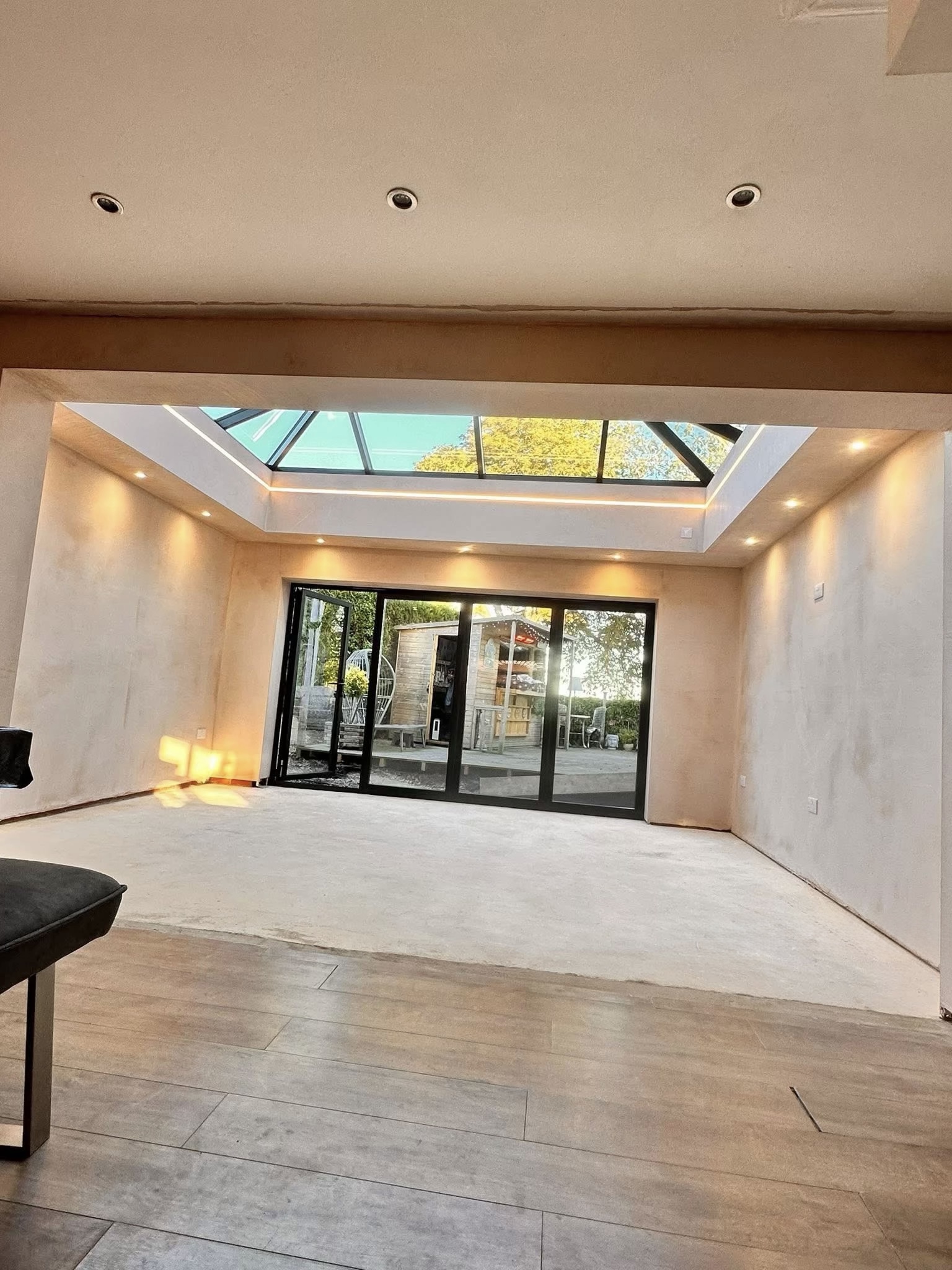 Op het terras installeerden we een hoogwaardig, inklapbaar lamellendaksysteem dat zorgt voor maximale flexibiliteit en comfort. Zo kan er in elk seizoen optimaal genoten worden van de buitenruimte, met controle over zonlicht en beschutting tegen weer en wind.